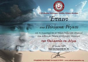 *το ποίημα διακρίθηκε στο διαγωνισμό του Συνδέσμου Πολιτισμού Ελλάδας Κύπρου «των Θαλασσών τα λόγια», Αποτελέσματα 14ου Διαγωνισμού Ποίησης “των Θαλασσών τα Λόγια” – Σύνδεσμος Πολιτισμού Ελλάδας Κύπρου | ΣΠΕΚ2025 και μπήκε στην ομώνυμη ανθολογία.
