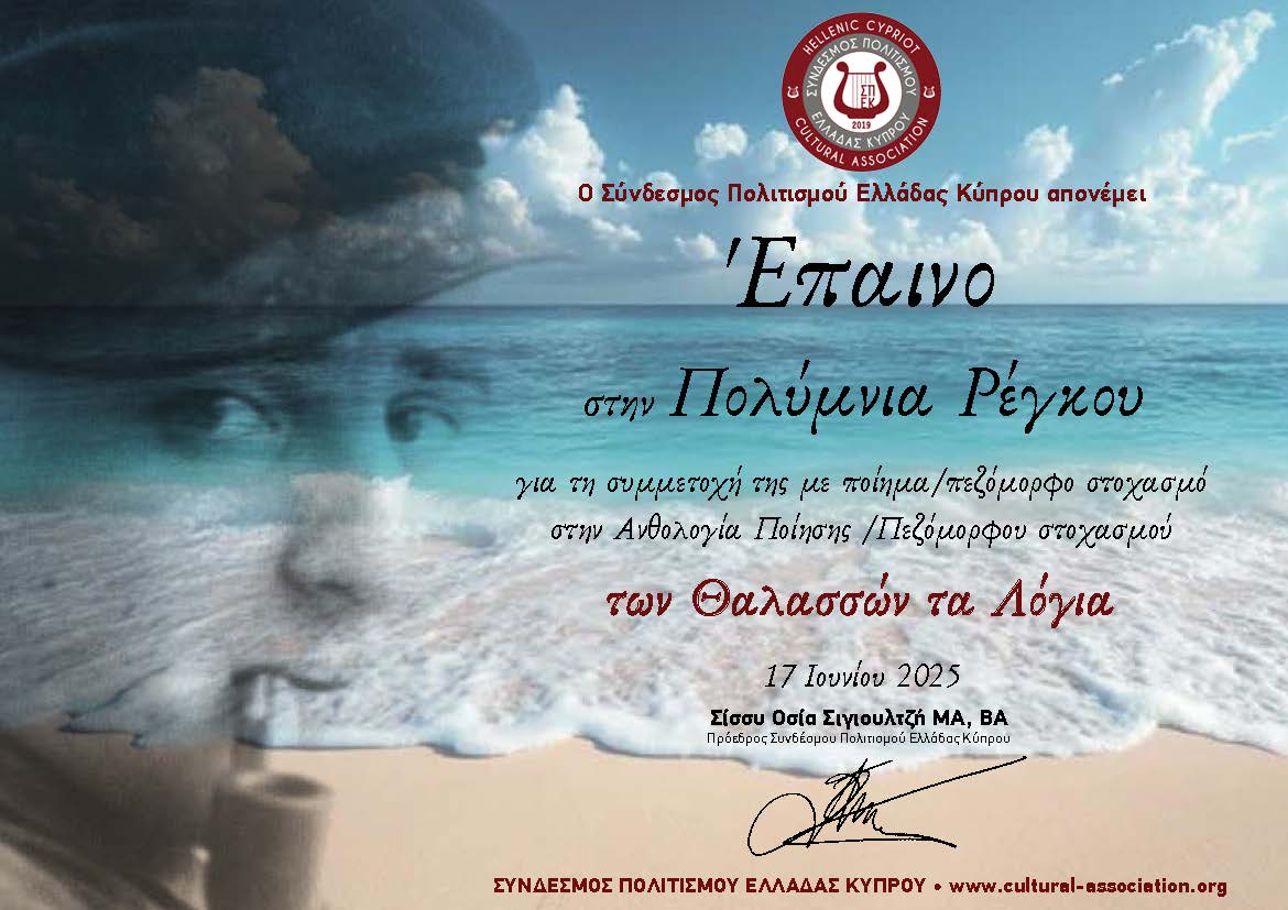 *το ποίημα διακρίθηκε στο διαγωνισμό του Συνδέσμου Πολιτισμού Ελλάδας Κύπρου «των Θαλασσών τα λόγια», Αποτελέσματα 14ου Διαγωνισμού Ποίησης “των Θαλασσών τα Λόγια” – Σύνδεσμος Πολιτισμού Ελλάδας Κύπρου | ΣΠΕΚ2025 και μπήκε στην ομώνυμη ανθολογία.